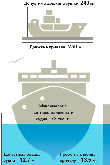 Причал має залізничну колію, що дає можливість обробляти вантажі по прямому варіанту.